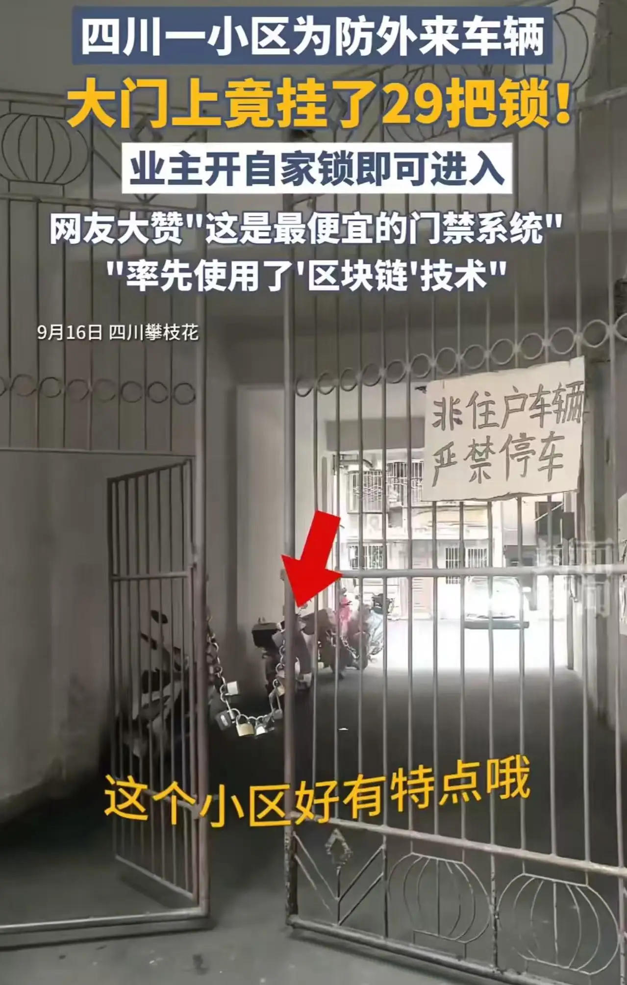 “人怎么可以聪明到这个样子?”在四川攀枝花的一个小区,有业主为防止不速之客进入小区,选择了一个令人匪夷所思的办法:在小区的入户门上挂了整整29把锁!每位业主只需用自己的钥匙打开那把属于自己的锁,其他锁则静静地守护着小区的安全。这一举动引发了热议,网友们纷纷调侃:“这虽然是最便宜的门禁系统,但却使用了超前的‘区块链’技术!”