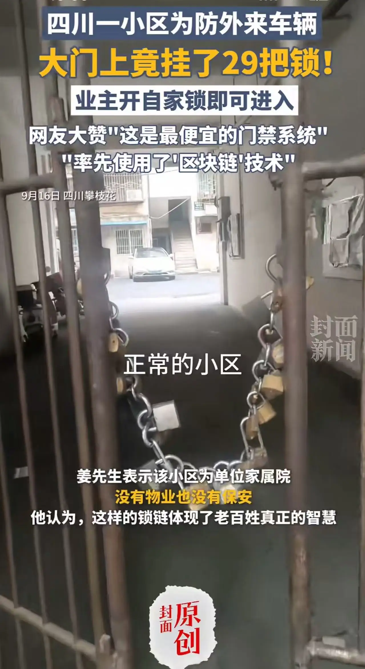 “人怎么可以聪明到这个样子?”四川攀枝花icon,一小区为了防止发来车辆进入,竟然在小区入户门上挂了29把锁,业主开自家锁即可进入。网友:“这虽然是最便宜的门禁系统,但却使用了超前的“区块链”技术!”